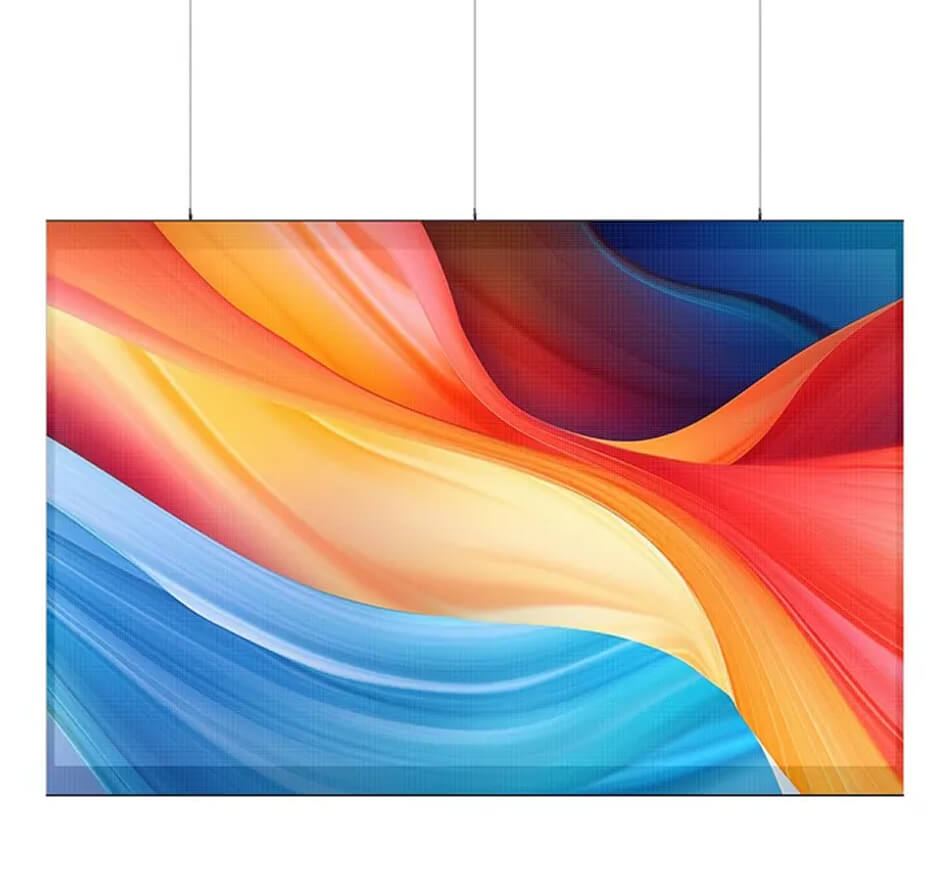 Catchy visuals on transparent glass. Storefronts and lobbies — content appears while everything behind remains visible.